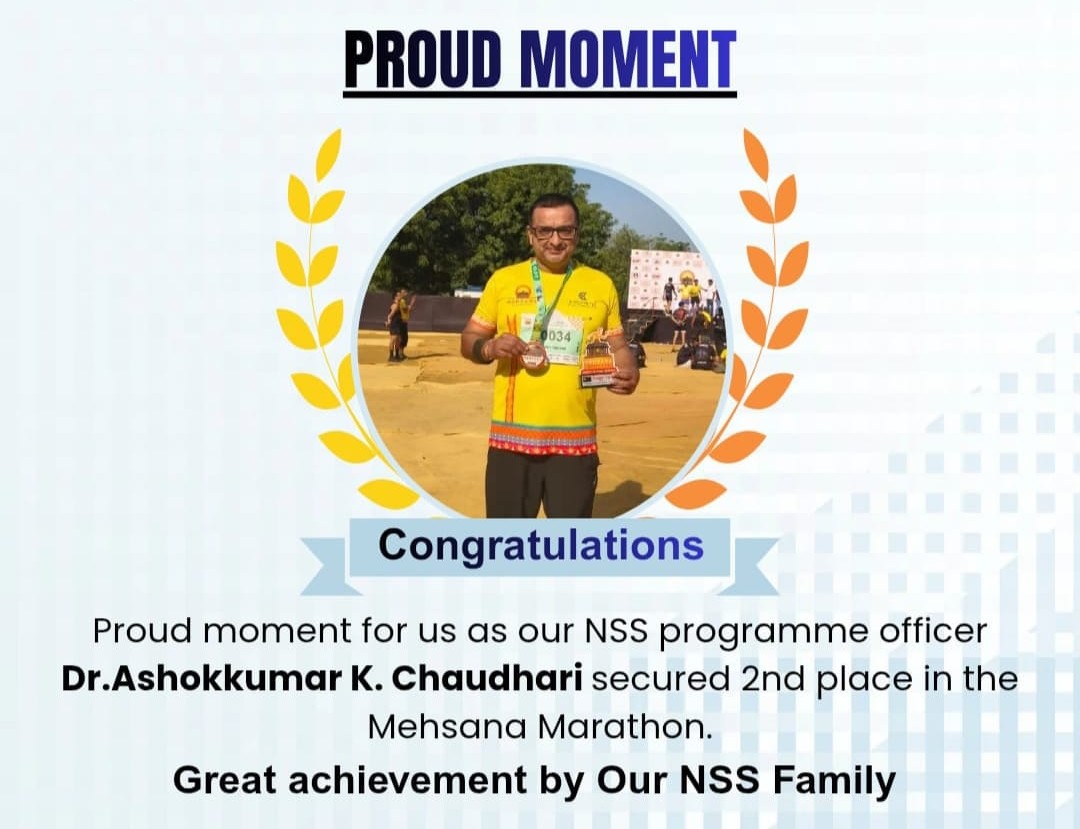 We proudly celebrate our NSS programme officer 2nd place achievement in the Mehsana Marathon. Your dedication and discipline truly inspire us. This strong performance reflects your hard work and consistency. You completed the race with focus, courage, and determination. Your achievement motivates our entire group to aim higher.Thank you for being a great example of passion and persistence. We feel proud and honored to have a mentor like you. May you continue reaching new milestones and goals. Wishing you more success and victories ahead.