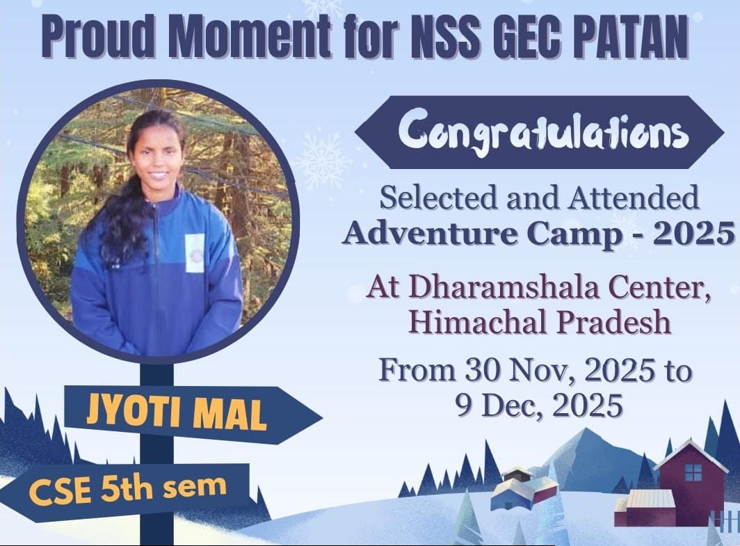 Heartiest congratulations to Jyoti Mal (5th Semester, Computer Science Engineering), NSS GEC Patan, on her selection and successful participation in Adventure Camp 2025, held at the Dharamshala Center, Himachal Pradesh, from November 30 to December 9, 2025, where her involvement reflected strong dedication to holistic development, physical endurance, and the adventurous spirit of the National Service Scheme.