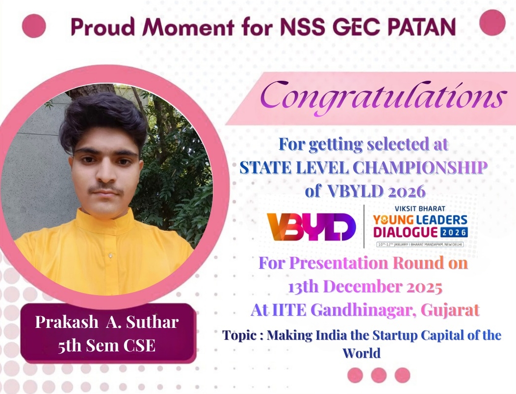 Heartiest congratulations to Prakash A. Suthar (5th Semester, Computer Science Engineering), NSS GEC Patan, on his selection to the State-Level Championship of VBYLD 2026, held at IITE Gandhinagar on December 13, 2025, where his presentation on “Making India the Startup Capital of the World” showcased his innovation, leadership, and commitment to national development.