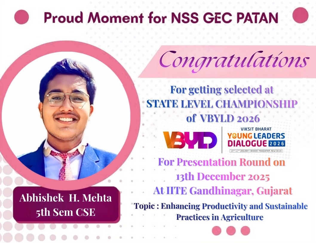We extend our heartiest congratulations to Abhishek H. Mehta (5th Semester, Computer Science Engineering), NSS GEC Patan, for his selection to the State-Level Championship of VBYLD 2026. Held at IITE Gandhinagar on December 13, 2025, the round evaluated clarity, social awareness, and public speaking. His presentation on sustainable agriculture reflected strong technical insight and social responsibility.